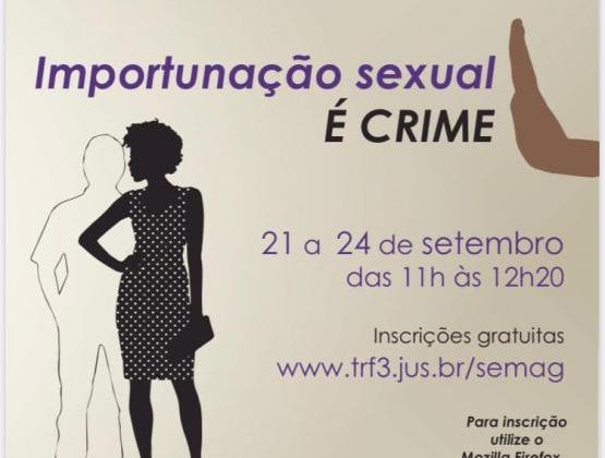 O evento “Importunação Sexual é Crime” será realizado no canal da EMAG no YouTube, das 11h às 12h20, com a presença do presidente do TRF3, desembargador Mairan Maia, da diretora da EMAG e presidente da Comissão de Equidade do Tribunal, desembargadora Therezinha Cazerta, e da CEO e diretora de Inovação da Think Olga, Juliana de Faria.